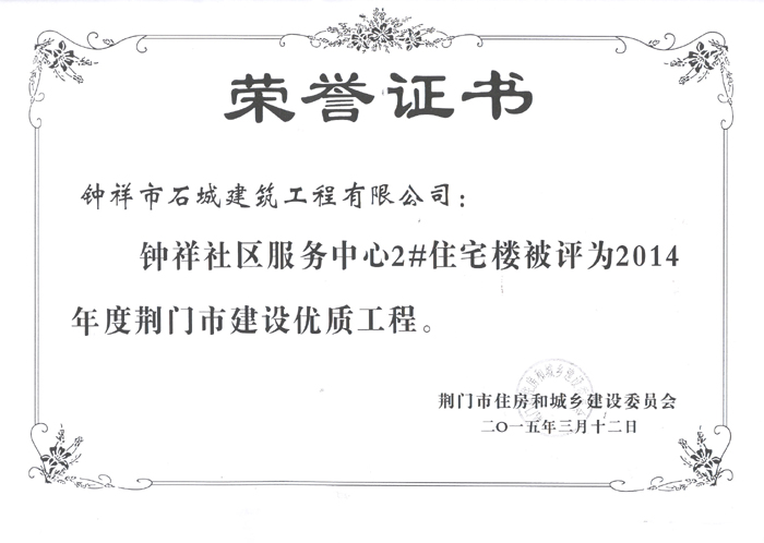 2015年3月12日被評(píng)為2014年度荊門(mén)市建設(shè)優(yōu)質(zhì)工程