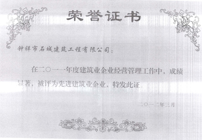 2012年3月被評(píng)為先進(jìn)建筑業(yè)企業(yè)