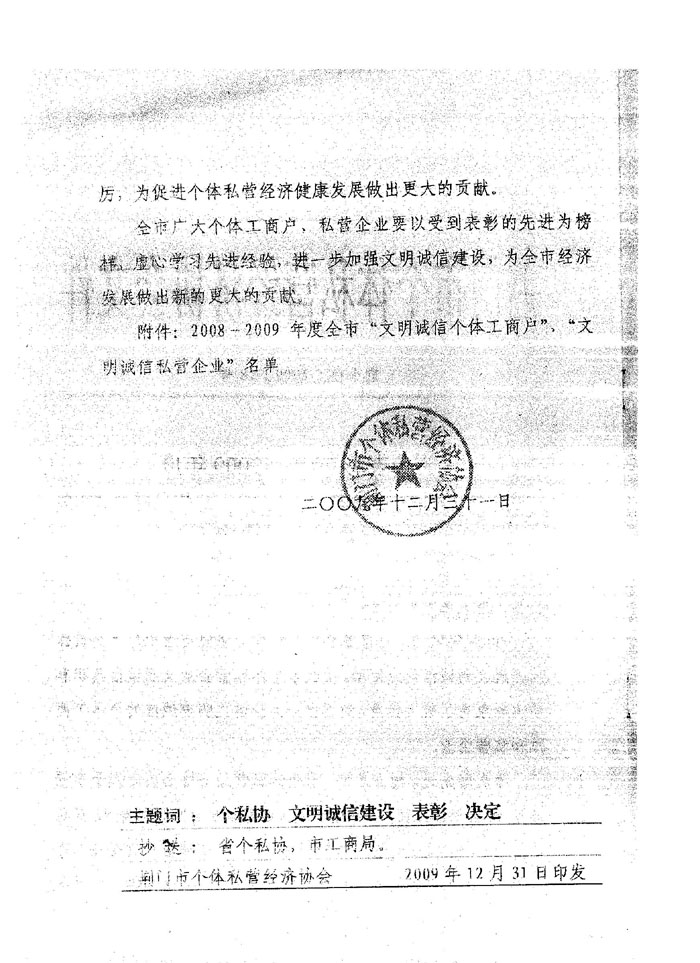 2009年12月榮獲2008-2009年度“文明誠信個體工商戶”